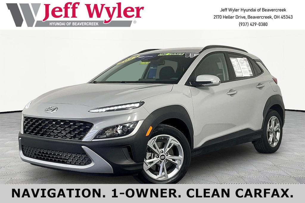 CARFAX One-Owner. Clean CARFAX. Certified. Hyundai Combined Details: * Limited Warranty: 60 Month/60,000 Mile (whichever comes first) from original in-service date (for Hyundai Certified Used Vehicles program) * Vehicle History (for Hyundai Certified Used Vehicles program) * Powertrain Limited Warranty: 120 Month/100,000 Mile (whichever comes first) from original in-service date (for Hyundai Certified Used Vehicles program) * Roadside Assistance (for Hyundai Certified Used Vehicles program) * Includes 10-year/Unlimited Mileage Roadside Assistance with Rental Car and Trip Interruption Reimbursement; Please See Dealers for Specific Vehicle Eligibility Requirements. 10-Year/100,000 Mile Hybrid/EV Battery Warranty. 3-Months SiriusXM Trial Subscription. Complimentary 1 Year (Connected Care & Remote Pkgs). (for Hyundai Certified Used Vehicles program), 6 Model Years Old and Newer With 80,000 - 120,000 Miles, 7-10 Model Years Old Vehicles With 120,000 Miles or Less. Powertrain Warranty 90 Days/5,000 Miles, HEV/PHEV Battery Warranty 10 Years/100,000 Miles. Roadside Assistance 90 Days/Unlimited Miles. Rental Car $35/Day Up to 5 Days. 3-Months SiriusXM Trial Subscription. (for Hyundai Select Used program) * 173+ Point Inspection (for Hyundai Certified Used Vehicles program), 117 Point Inspection (for Hyundai Select Used program) * Warranty Deductible: $50 (for Hyundai Certified Used Vehicles program)Jeff Wyler Hyundai of Beavercreek is delighted to offer this stunning 2023 Hyundai Kona SEL in Cyber Silver. Well equipped with: Option Group 01, 17" x 7.0J Alloy Wheels, 4-Wheel Disc Brakes, 5.715 Axle Ratio, 6 Speakers, ABS brakes, Air Conditioning, Alloy wheels, AM/FM radio: SiriusXM, Apple CarPlay & Android Auto, Brake assist, Bumpers: body-color, Carpeted Floor Mats, Cloth Seat Trim, Delay-off headlights, Driver door bin, Driver vanity mirror, Dual front impact airbags, Dual front side impact airbags, Electronic Stability Control, Emergency communication system: Blue Link Connected Car Service (3-year complimentary subscription), Exterior Parking Camera Rear, Four wheel independent suspension, Front anti-roll bar, Front Bucket Seats, Front Center Armrest, Front reading lights, Fully automatic headlights, Heated door mirrors, Illuminated entry, Low tire pressure warning, Occupant sensing airbag, Outside temperature display, Overhead airbag, Overhead console, Panic alarm, Passenger door bin, Passenger vanity mirror, Power door mirrors, Power driver seat, Power steering, Power windows, Radio: AM/FM/HD/SiriusXM Audio System, Rear anti-roll bar, Rear seat center armrest, Rear window defroster, Rear window wiper, Remote keyless entry, Security system, Speed control, Speed-sensing steering, Split folding rear seat, Spoiler, Steering wheel mounted audio controls, Tachometer, Telescoping steering wheel, Tilt steering wheel, Traction control, Trip computer, Turn signal indicator mirrors, and Variably intermittent wipers.Come see the excitement at Jeff Wyler Hyundai of Beavercreek! Visit us online at www.jeffwylerhyundaiofbeavercreek.com Proudly Serving: Cincinnati, Dayton, Centeville, Ketttering, Moraine,Beavercreek, Xenia,Oakwood, Trotwood, Vandalia, Kettering, Wright Patterson, Riverside, Engelwood, Miamisburg, Huber Heights, Springboro, Brookville, Fairborn, West Carrollton, Yellow Springs, Bellbrook, Springfield Columbus, Hamilton, West Chester, Monroe, Fairfield.