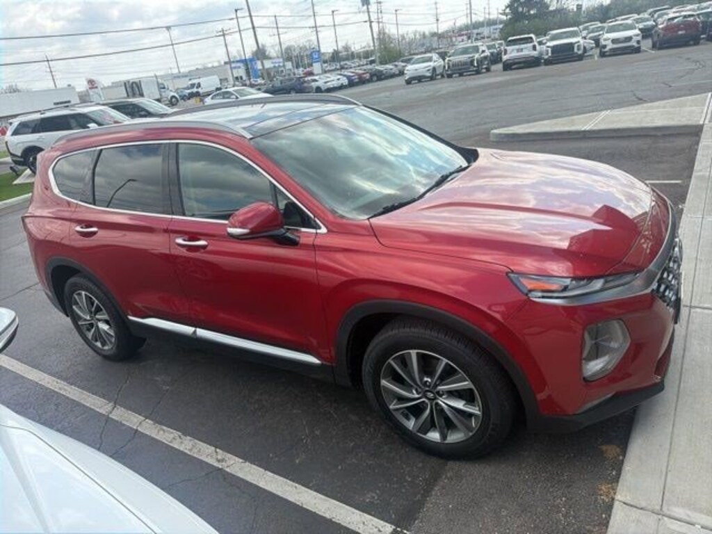 Jeff Wyler Hyundai of Fairfield is pumped up to offer this beautiful 2019 Hyundai Santa Fe Ultimate in Scarlet Red. Well equipped with: Option Group 01, AWD, Black Leather, Android Auto, Apple CarPlay, CALL NOW FOR YOUR VIP APPOINTMENT 513-870-9800, FULLY SERVICED w/RECORDS, GUARANTEED FINANCING!! NO MATTER YOUR SITUATION WE CAN GET AN APPROVAL!!, THE #1 Volume dealer in the region! Come see why for yourself Today!!, WE PAY MORE FOR YOUR TRADE!!, 12 Speakers, 18" x 7.5J Alloy Wheels, 4-Wheel Disc Brakes, ABS brakes, Air Conditioning, Alloy wheels, AM/FM radio: SiriusXM, Apple CarPlay & Android Auto, Auto High-beam Headlights, Auto-dimming Rear-View mirror, Automatic temperature control, Axle Ratio 4.081, Brake assist, Bumper Applique, Bumpers: body-color, Cargo Cover, Cargo Net, Carpeted Floor Mats, Compass, Delay-off headlights, Driver door bin, Driver vanity mirror, Dual front impact airbags, Dual front side impact airbags, Electronic Stability Control, Emergency communication system: Blue Link, Exterior Parking Camera Rear, Four wheel independent suspension, Front anti-roll bar, Front Bucket Seats, Front Center Armrest, Front dual zone A/C, Front fog lights, Front reading lights, Fully automatic headlights, Garage door transmitter: HomeLink, Heads-Up Display, Heated & Ventilated Front Bucket Seats, Heated door mirrors, Heated front seats, Heated rear seats, Heated steering wheel, Illuminated entry, Leather Seating Surface, Leather Shift Knob, Leather steering wheel, Low tire pressure warning, Memory seat, Navigation System, Occupant sensing airbag, Outside temperature display, Overhead airbag, Overhead console, Panic alarm, Passenger door bin, Passenger vanity mirror, Power door mirrors, Power driver seat, Power Liftgate, Power moonroof, Power passenger seat, Power steering, Power windows, Radio: Infinity Premium AM/FM/MP3 Display Audio, Rain sensing wipers, Rear anti-roll bar, Rear seat center armrest, Rear window defroster, Rear window wiper, Remote keyless entry, Roof rack: rails only, Security system, Speed control, Speed-sensing steering, Split folding rear seat, Spoiler, Steering wheel mounted audio controls, Tachometer, Telescoping steering wheel, Tilt steering wheel, Traction control, Trip computer, Turn signal indicator mirrors, Variably intermittent wipers, and Ventilated front seats. TO CHECK ON THE AVAILABILITY OF THIS VEHICLE REACH OUT TO ONE OF OUR TEAM MEMBERS!! ALSO SHOP ONLINE AT https://www.jeffwylerhyundaioffairfield.com/ Proudly Serving: Cincinnati, Dayton, Columbus, Louisville, Lexington, Indianapolis, Hamilton, Florence, Alexandria, Beavercreek, Springdale, West Chester, Monroe, Fairfield, Kenwood, Newport and all of greater Cincinnati Ohio, Indiana, and Northern Kentucky.